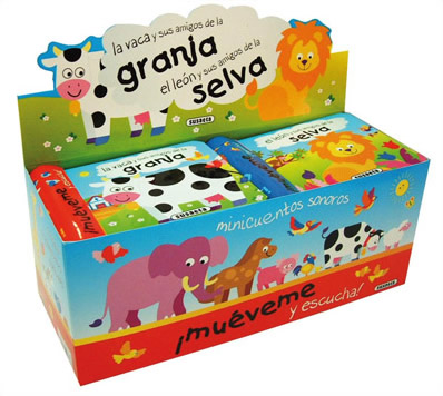 Cartoné con cubierta plastificada y hojas de cartón con módulo de sonido en el lomo. Minicuentos sonoros